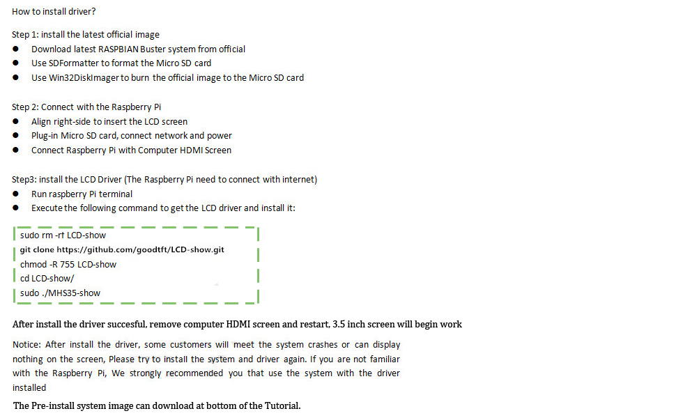 - チュートリアルの終了時に、Pi4用のプリインストールドライバーRASPBAINバスターシステムイメージを提供します。
