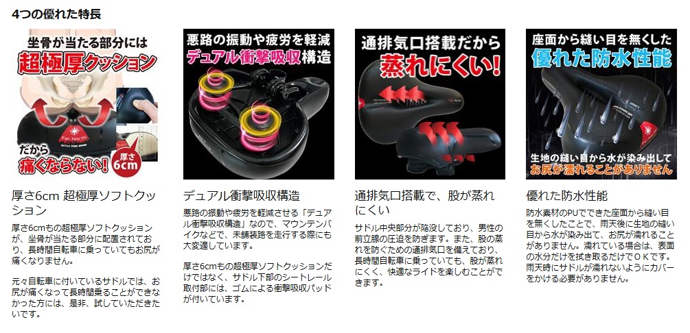 元々自転車に付いているサドルでは、お尻が痛くなって長時間乗ることができない方のための、超極厚ソフトクッション内蔵の自転車サドルです。
