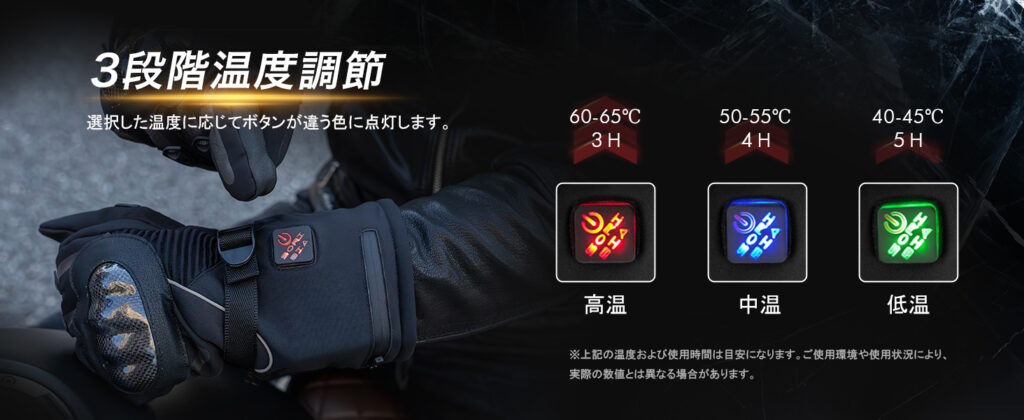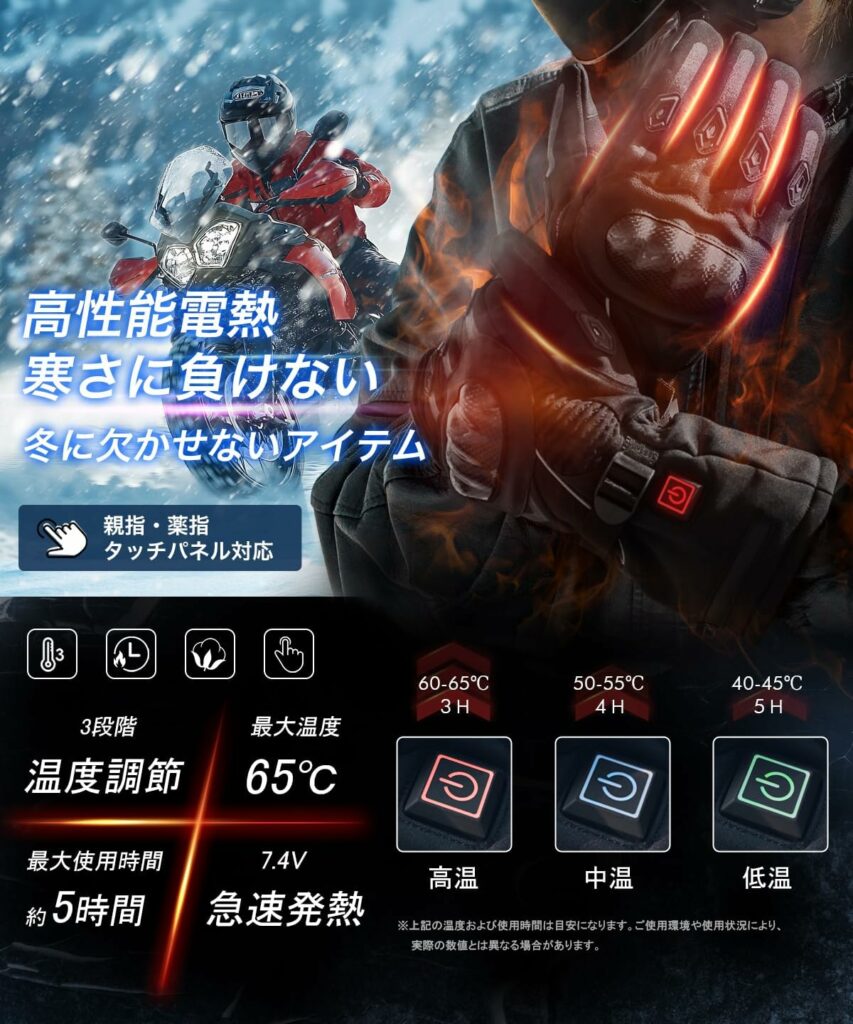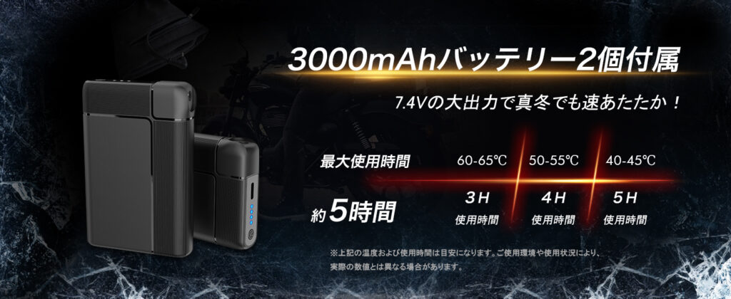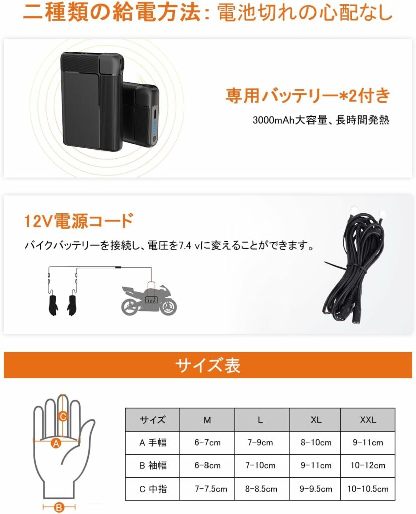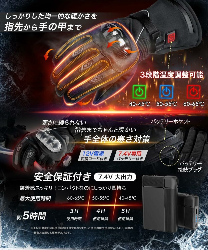 - 【2種類給電方法】2種類の給電方法があり、ニーズに合わせてお選びいただけます。①3000mAh 7.4V/2A バッテリーが左右用に2個付属しております。長時間発熱:高温(赤)約2.5-3時間、中温(青)約4時間、低温(緑)約5時間。②12 v電源コード付き、付属のバッテリーの他、バイクバッテリーで電気を供給することもできます。バイクバッテリーに接続し、電圧を7.4 vに変えて、グロープに給電することができます。
