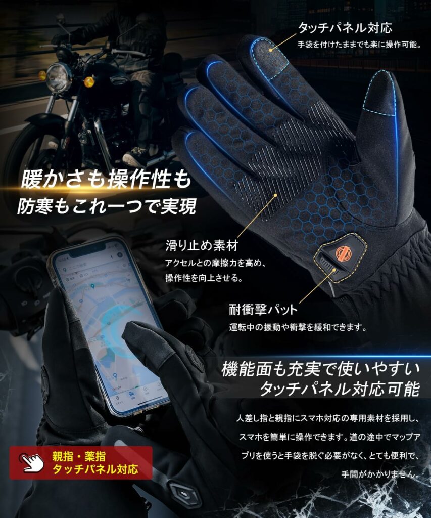 - 【スマホ対応・防水仕様】人差し指と親指にスマホ対応の専用素材を採用し、スマホを簡単に操作できます。道の途中でマップアプリを使うと手袋を脱ぐ必要がなく、とても便利で、手間がかかりません。表面には防水生地を採用し、雨や雪の日でも雨水が浸透せず、安心して運転しながら使用できます。どんな環境でも安心してご使用できます。