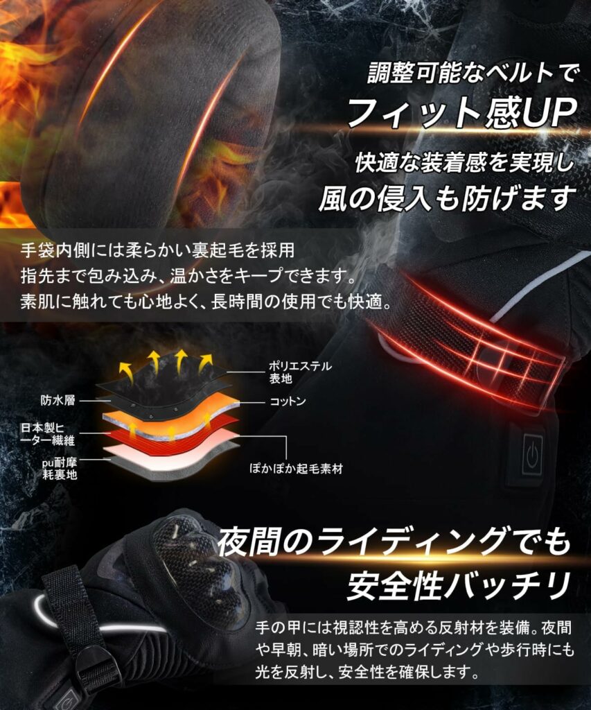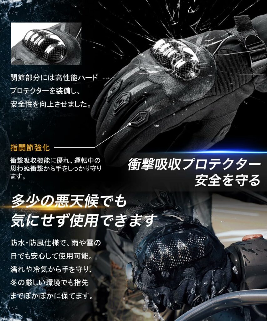 - 【関節強化・滑り止め】関節強化、安全性アップ:関節の部分は優れたハードプロテクターで強化し、安全防護性がアップします。より良い耐衝撃性と衝撃吸収機能があり、運転中の意外から手を保護します。滑り止め・耐摩擦性:手のひら部分に滑り止め素材を採用し、手のひらとアクセルの摩擦力を高め、アクセルの制御をより正確にして、操作性が上昇し、バイクの運転をより安全にします。ご注意:左右の手に温度差があるのは正常な現象で、体の各部の温度に対する感知は少し差があるので、安心してください。着るまた外しときは、最も緩いようにベルトを調節してください。サイズについては、快適性を考慮するため、手より少し大きくなり、ご了承ください。