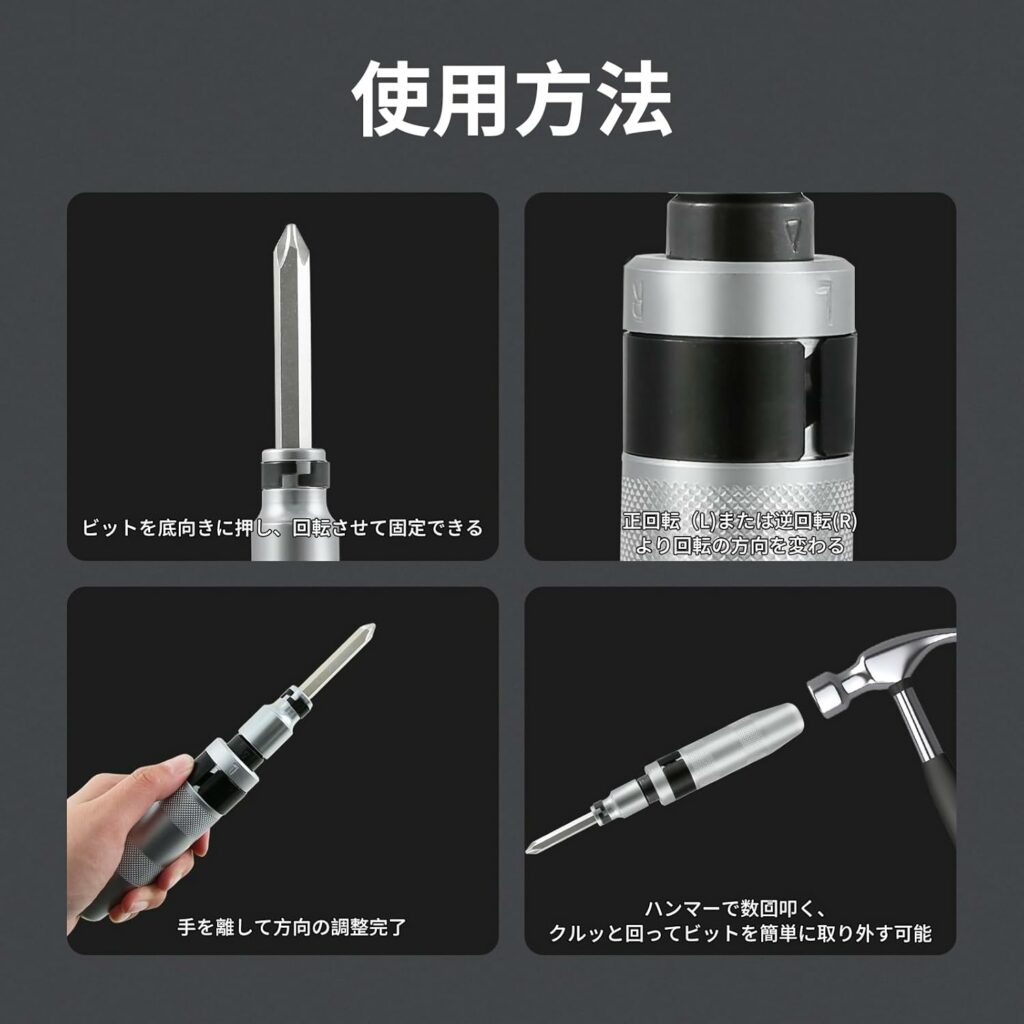 - 【簡単に使用】弊社のショックドライバーの使い方は簡単で、ショックドライバーを組み立て、外したいネジにビットをセットし、ハンマーで本体を叩くことでネジがスムーズに緩められ、専門な知識が必要なく、初心者の方でも短時間の中に使用方法を把握できます。