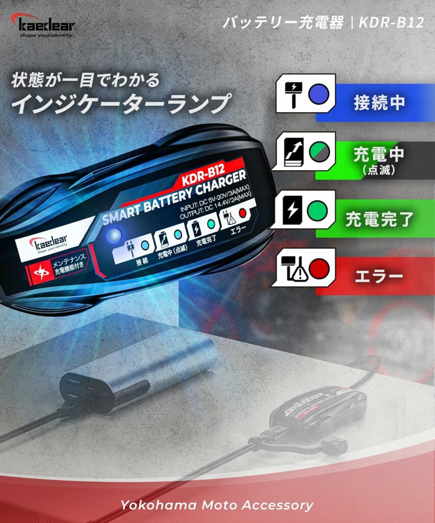 Kaedear(カエディア) バイク バッテリー充電器 USB 入力 12V バッテリー チャージャー 充電器 2A メンテナンス充電 機能 付き KDR-B12