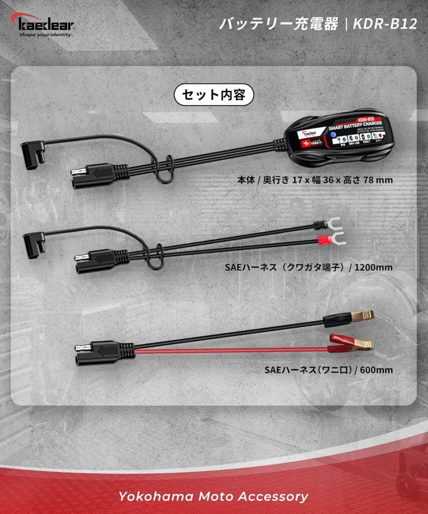 • 【製品仕様】 ◾️インジケーターランプ   青点灯:接続中、緑点滅:充電中、緑点灯:満充電、赤点灯:エラー ◾️入力電圧:5〜20V(タイプCコネクター) ◾️出力電圧:3〜14.4V ◾️出力電流:最大2A ◾️保護回路:逆接続/過電圧/過電流/ショート ◾️セット内容:本体、SAEハーネス/1200mm、SAEハーネス(ワニ口)/600mm ◾️取扱説明書(オンラインのみ):環境負荷の軽減を目指した脱炭素化への取り組みとして、紙媒体での同封を控えさせていただいております。Kaedear公式サイトの各商品ページから閲覧またはダウンロードが可能です。