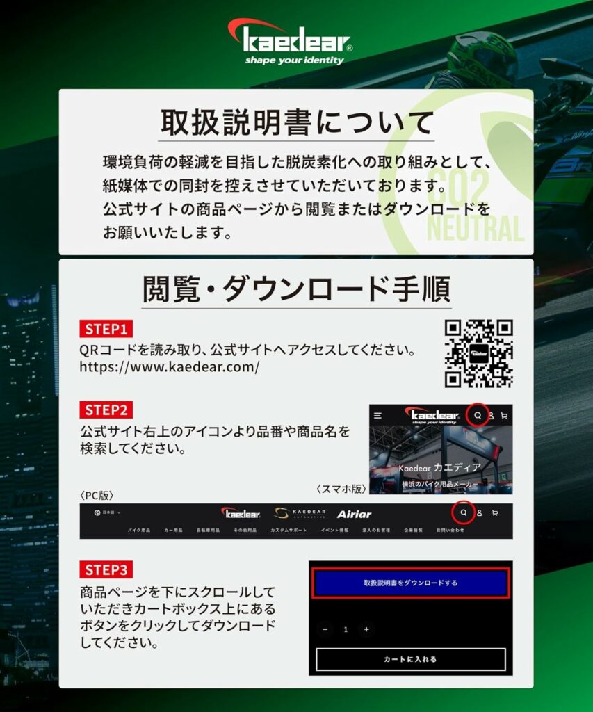 • 【メーカー保証とアフターサービスについて】 メーカー保証期間:1年(ご購入日と同日が期限) カエディアではお客様にご満足頂ける様、販売後もサポートさせて頂きます。 商品のご不明な点はもちろん、バイクへのお取り付けに関するご相談は、国家整備資格を保有したスタッフがおりますので、専門知識に対しても的確に対応させて頂きます。 万一、製品不良に起因する不具合と診断される場合は、弊社のメーカー保証規定に基づき審議させて頂き、メーカー保証による無償での修理、交換を行わせて頂きます。 業務用に使用される際は、メーカー保証期間を半分の期間とさせて頂きます。(例:メーカー保証期間が1年の場合、6ヶ月となり、ご購入日の月に6ヶ月を加算した同日が期限) 詳細は公式サイト内メーカー保証規定をご覧下さい。 お取り付け後、ご使用後でも、対応させて頂きます。日本メーカーとして、おもてなしの心で対応致します。先ずはお気軽にご相談下さい。