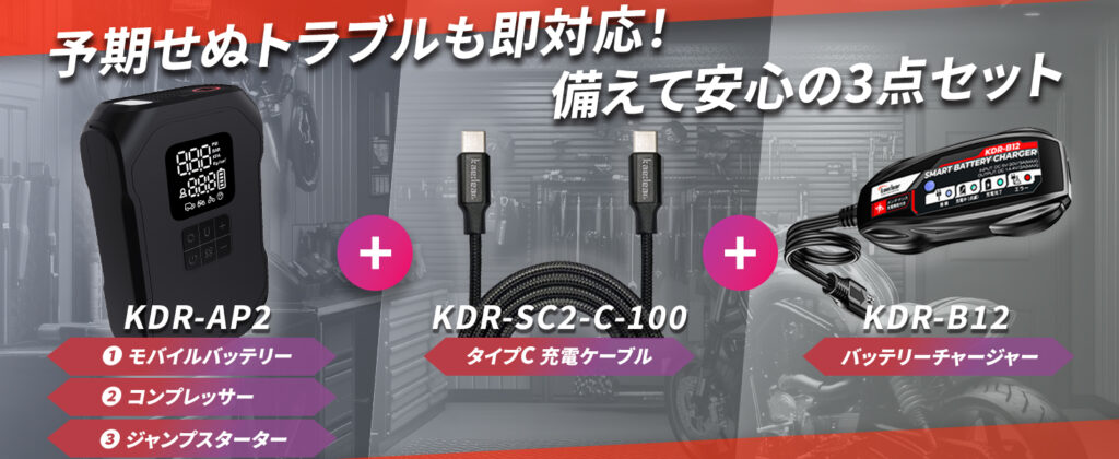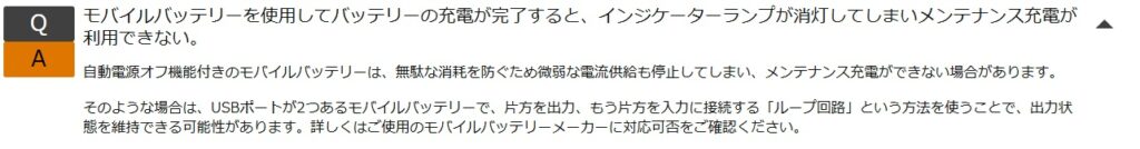 • 【ご使用上の注意】 ■本製品はメンテナンス充電機能を備えているため、車両バッテリーが満充電となった後も、状態維持のために微量の電力を消費し続けます。 一般的なモバイルバッテリーには、リチウムイオンバッテリー保護のため、一定以下の電圧低下を防ぐ過放電保護機能が搭載されております。 しかしながら、一部のモバイルバッテリーでは、スマートフォンなど接続機器側の充電制御に依存した設計となっており、モバイルバッテリー本体側に過放電保護機能が搭載されていない、または十分でない製品がございます。 そのようなモバイルバッテリーを本製品に接続した場合、メンテナンス充電機能により電力を消費し続けることで、モバイルバッテリーが過放電状態となり、充電しても復旧できず、その後使用できなくなる場合がございます。 本製品をモバイルバッテリーでご使用になる際は、お使いのモバイルバッテリーに過放電保護機能が搭載されていることをご確認のうえ、ご使用をご検討ください。 なお、モバイルバッテリーは弊社製品ではないため、適合可否や動作保証についてはご案内いたしかねます。 保護機能の有無や仕様につきましては、販売元または製造元へご確認いただきますようお願いいたします。