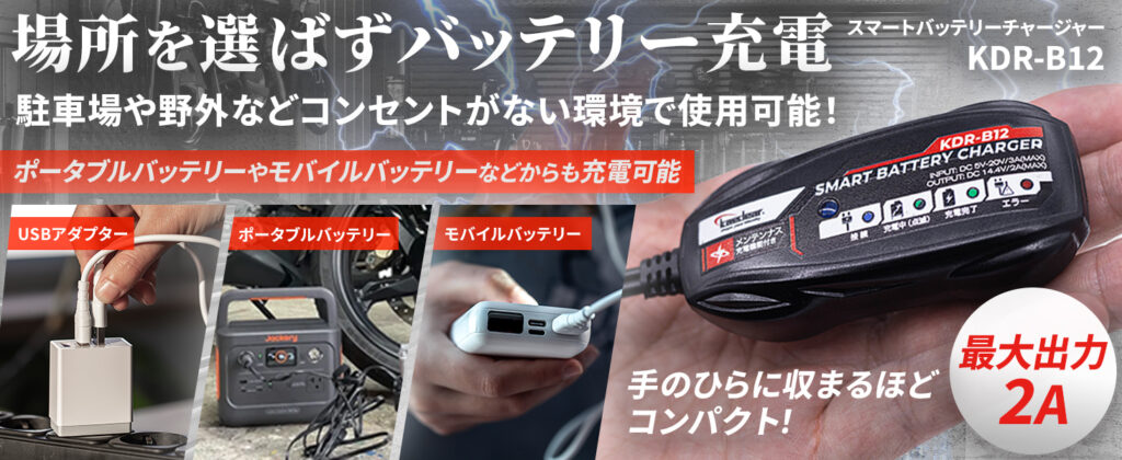 • 【スマートバッテリーチャージャー】 USB入力対応バッテリー充電器 コンセントがない環境でも、手軽にバッテリー充電が可能なUSB入力タイプのバッテリー充電器です。DC12Vの鉛バッテリーやリチウムイオンバッテリーに対応し、幅広い用途にご使用いただけます。 USB電源から充電可能 従来の100AC電源ではなく、USB電源を利用して充電する設計です。ポータブルバッテリーやモバイルバッテリーを電源にできるため、駐車場にコンセントがない場合でもバッテリー充電が可能。 ※アイドリングストップ対応EFBバッテリー、バイク・車用以外のリチウムバッテリー、ジェルバッテリー(無液バッテリー)は非対応です。 ※ご注意:一部のモバイルバッテリーには、消費電力を抑える機能が搭載されており、バッテリー充電完了後に自動で電源が切れるためメンテナンス充電が利用できない可能性があります。 その際、ループ回路(モバイルバッテリーにUSBポートが2つある場合、1つをモバイルバッテリーの入力に戻す方式)を行うことで、連続稼働を維持できる可能性があります。この機能はモバイルバッテリーが充電状態、又はUSB出力状態である場合に電源ONが継続します。本機能の有無についてはモバイルバッテリーのメーカー様へご相談ください。