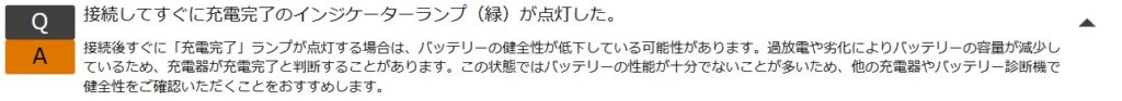 ただ、いつも繋いで充電してみるのですが、バッテリーが元気なのか?すぐに「充電完了」のランプが付いてしまいます。