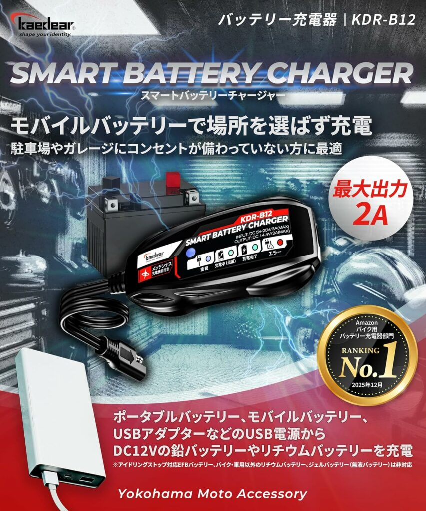 • 【使用環境を選ばない手軽さと利便性】 高効率の自動最適化充電 最大2Aの出力(※入力電源による制限あり)で、バッテリーを満充電まで自動的に最適化し、バッテリーの劣化を防ぎながら効率的に充電を行います。 メンテナンス充電機能 充電完了後も、電圧低下を検知すると自動で再充電を開始するメンテナンスモードを搭載。充電器をつなぎっぱなしでもバッテリーの状態を最適に保ちます。 簡単接続が可能なSAEコネクター対応 車体に配線を残してSAEコネクターを差すだけで充電を開始できます。また、付属のワニ口クリップを使用すれば、直接バッテリーへの接続も簡単です。 便利で幅広い利用シーン USB入力に対応することで、ポータブルバッテリーやモバイルバッテリーなどからも充電可能。 駐車場や野外など、コンセントがない環境でも活躍します。 このUSB入力バッテリー充電器は、バッテリー充電に手軽さと利便性を求める方に最適な製品です。車両やポータブル電源を利用するシーンでぜひご活用ください。