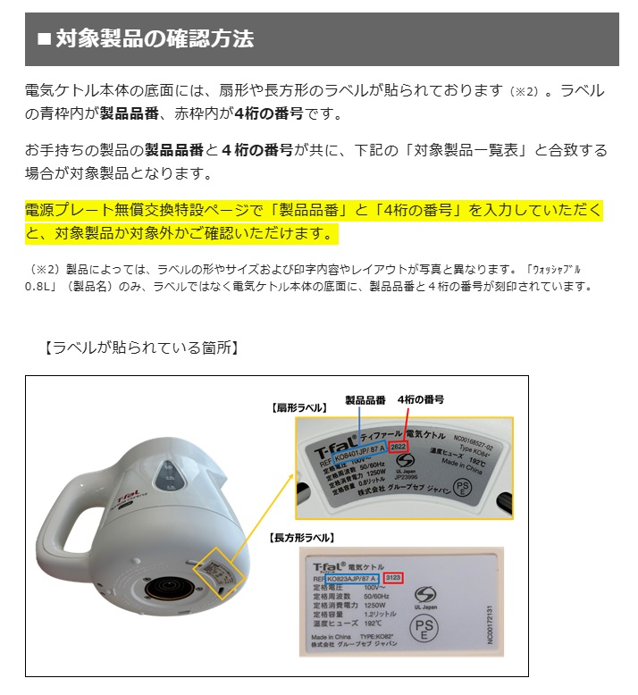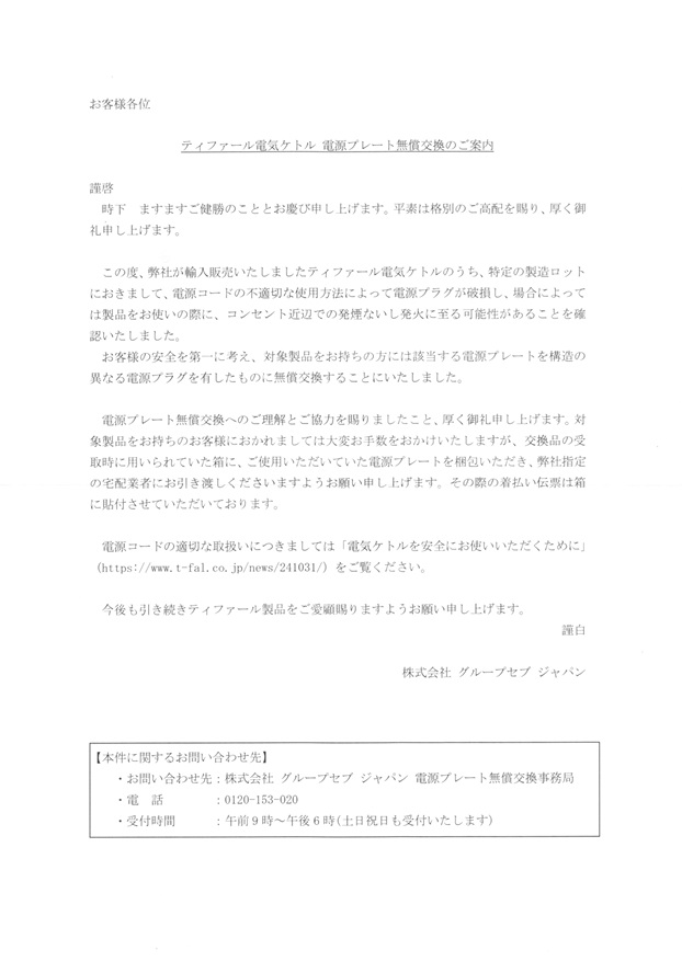 弊社が輸入販売いたしました、2021年10月から24年7月までに製造されたティファールの電気ケトルのうち、特定の製造ロットにおきまして、電源コードの不適切な使用方法(※1)によって電源プラグが破損し、場合によっては製品をお使いの際に、コンセント近辺での発煙ないし発火に至る可能性があることを確認いたしました。