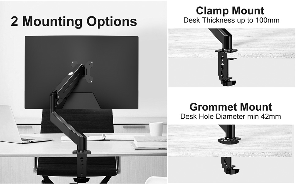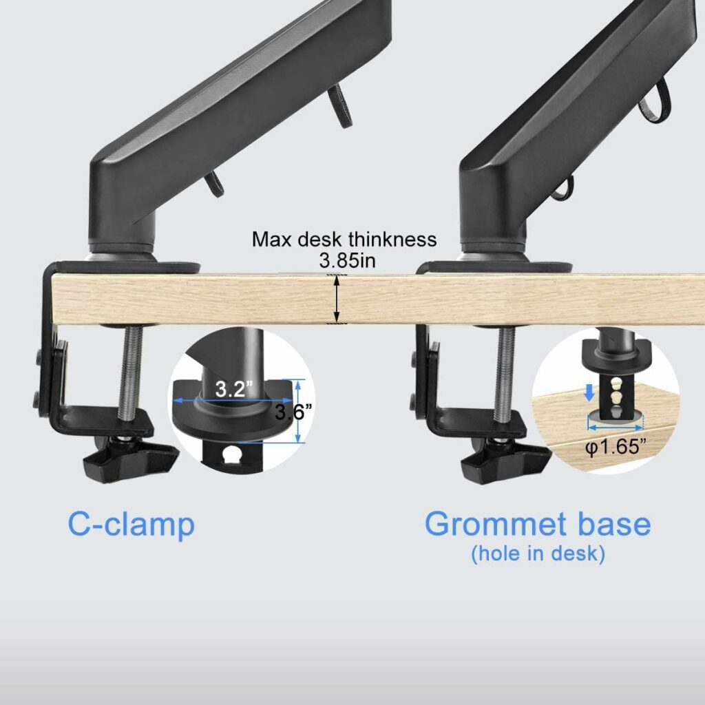- 2つの取り付けオプション – Cクランプとオプションのグロメットベース(厚さ3.85インチまでのデスクにフィット)により、貴重なデスクスペースを節約できます。