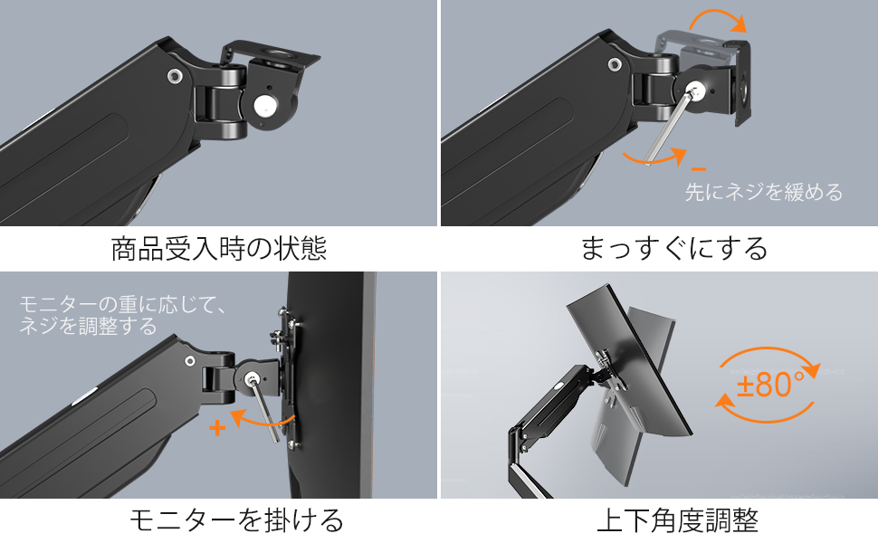 - フルモーション – 高さ調整が簡単、360°回転、上下±80°傾き、左右±180°回転。