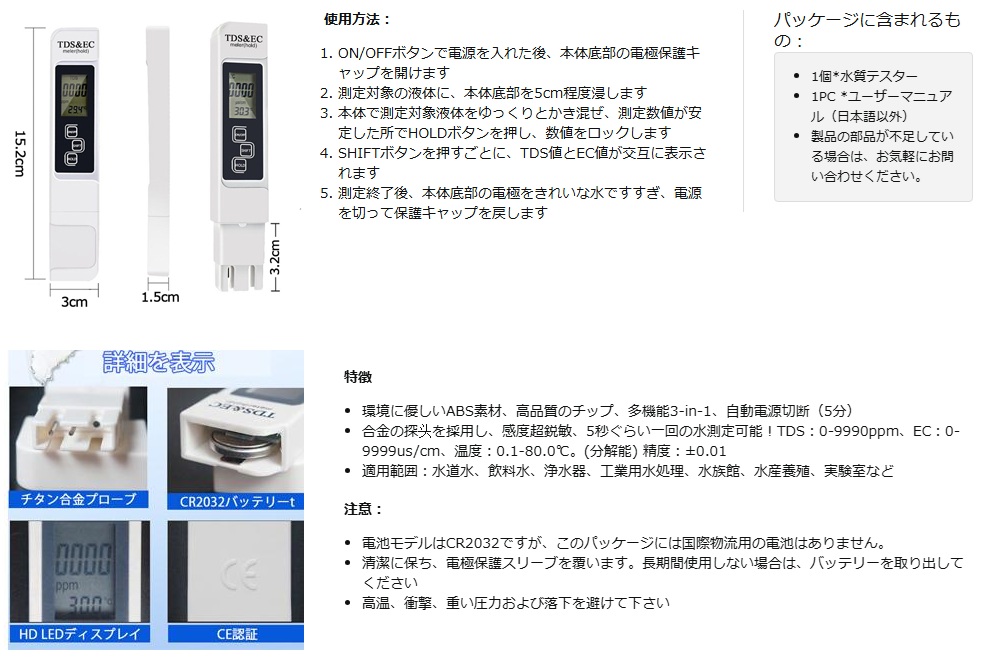 | 測定項目: | TDS値、EC導電率、摂氏温度°C、華氏温度°F |